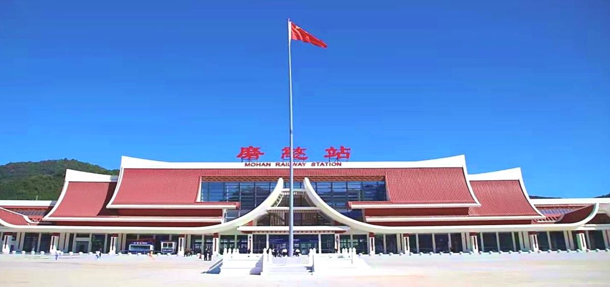 11.磨憨站位于云南省磨憨經(jīng)濟(jì)開發(fā)區(qū)尚勇鎮(zhèn)東側(cè),距鎮(zhèn)中心約1公里。車站為線側(cè)下式站房,總建筑面積為15768平方米,最高聚集人數(shù)為600人,站房主體一層,兩側(cè)二層,局部地下一層。旅客乘降站臺2座、到發(fā)線3條,目前進(jìn)站口分為國內(nèi)出發(fā)、國際出發(fā),出站口分為國內(nèi)到達(dá)、國際到達(dá)。采用驗(yàn)檢分開的進(jìn)站檢票模式。設(shè)國內(nèi)候車區(qū)、國際候車區(qū)、商務(wù)候車室、行政貴賓室、母嬰候車室及重點(diǎn)旅客候車區(qū)。